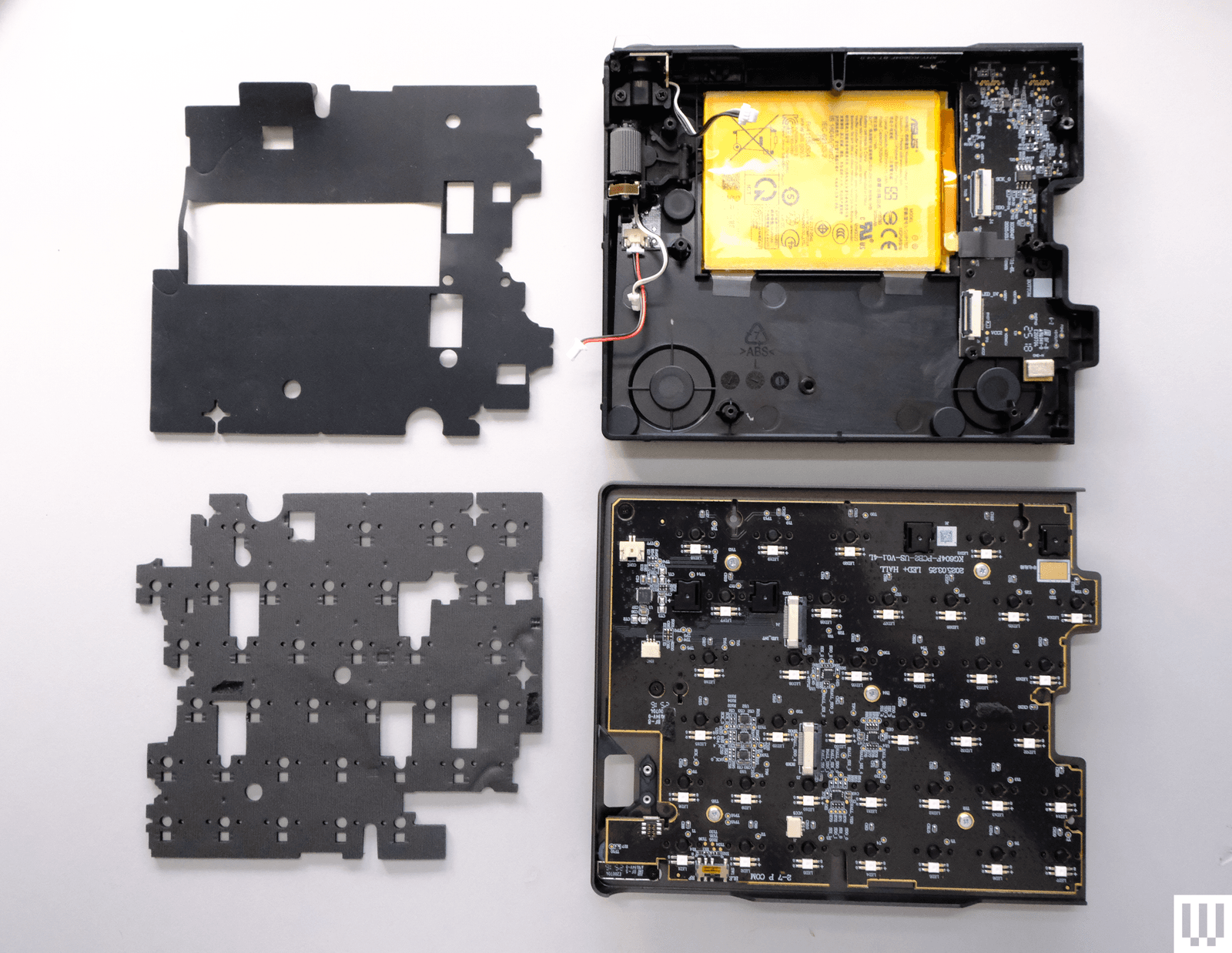 The top and bottom halves can easily be split apart by removing the screws on the plate (no breakable plastic clips here!), but on the left half, four cables connect the top and bottom halves of the keyboard, all of which need to be disconnected before fully separating the two sections. Once this is done, the internal silicone sound-dampening can easily be removed. The foam dampening, however, was adhered strongly enough that removing it left chunks of foam stuck to the PCB, making it impossible to readhere without using new adhesive. This wasn’t a huge issue, since the foam could simply be placed into the keyboard, but it is still frustrating to see when most manufacturers have figured this out.